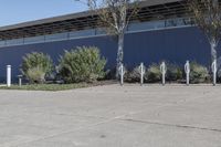 there are trees on the concrete in front of this building that has several signs around it