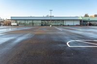 an empty parking lot in front of a building at the edge of a street with parking spaces in it