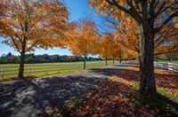 autumn trees line a dirt road in a beautiful park setting surrounded by a white fence