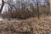 A serene landscape in Ontario, Canada. The clear sky reflects on the calm lake, surrounded by a forest of deciduous trees. The autumn colors paint the ground with a carpet of brown leaves and undergrowth.
