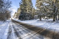 A road in Ontario, Canada, surrounded by snow-covered trees and forests. The bright sun casts hard shadows on the snow-covered road. The natural beauty of the landscape is enhanced by the contrast of the white snow against the dark shadows.