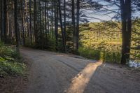 a lone, empty dirt road in an open forest beside water, with trees and bushes growing around