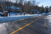 snow covered road going toward a large house on a sunny day next to trees and trees
