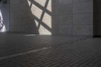 This is an image of a modern architecture building in Toronto, Ontario, Canada. The monochrome photo captures the sleek lines and hard shadows of the concrete structure against a clear sky. The sandstone walls provide texture and contrast. Inside, the room features black tile flooring and a wood accent wall. The lighting creates interesting shadows and highlights on the surfaces. This photo represents the urban design and city life in Toronto, showcasing the combination of modern and traditional elements in the city's architecture.