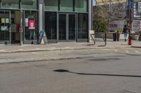 A modern architectural marvel in the heart of Toronto, Ontario. The empty city street is lined with tree-filled parks and sleek buildings. A lone man and a vibrant red fire hydrant bring a pop of color to the urban landscape.