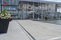 This is an image of a modern architecture building in the business district of Toronto, Ontario, Canada. The building's facade is made of composite materials and glass, reflecting the surrounding urban design. A walkway with metal and concrete surfaces can be seen leading to the entrance of the building. The cityscape is filled with office buildings, shops, and vegetation, adding to the vibrant atmosphere of the area. This photo showcases the combination of nature and urban infrastructure, highlighting the dynamic and prosperous nature of Toronto's business scene.