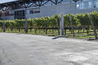 A beautiful rural road in Ontario, lined with trees and shadowed by a clear sky. A large building with vines on its side stands against the backdrop of a vibrant vineyard. Toronto's agriculture at its finest.