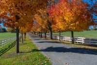 This is an image of a road in rural Ontario, Canada. The road is lined with trees on both sides and is bordered by a long fence in a park. The clear sky overhead contrasts with the greenery of the field beside the road. This photo showcases the peaceful rural scenery of Ontario, with its wide expanses of agriculture and natural beauty. The road leads towards Toronto, the bustling city in Ontario. It represents a typical day in the countryside, where nature and tranquility abound.