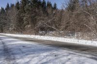 This is an image taken in Ontario, Canada, showing a snow-covered road winding through a picturesque landscape. The road is flanked by dense forests and tall trees, showcasing the beauty of the winter season. The clear sky above contrasts with the white snow, creating a serene atmosphere. The road surface is covered in snow, with vegetation visible along the slopes. This photo captures the peacefulness and natural scenery of Ontario during winter. It is a perfect representation of the tranquility and beauty of nature in Canada.