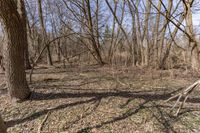 a dirt path in the woods with trees and grass to its right that has a tree branch sticking out