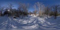 snow covered ground with trees and some skis in the snow near them and trees and blue sky