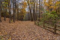 a dirt trail surrounded by trees on a cloudy day in autumn or fall is pictured