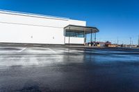 Empty car dealership at the intersection of highways in Ontario. Clear blue sky contrasts with the asphalt road. A typical day in Toronto, with parking lots and storefronts of various shops.
