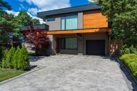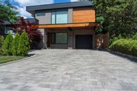 This is an image of a modern two-story home in Ontario, Canada. The home features wooden accents and a spacious driveway in front of a brick wall. It is located in a suburban neighborhood in Toronto. The clear skies above highlight the tree-lined courtyard and the grassy surfaces surrounding the house. In the background, a parking garage can be seen. This photo showcases a typical day in a residential area of Ontario, surrounded by the peacefulness of the suburbs.