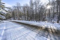 A beautiful landscape in Canada's Ontario province. The sunlight shines through the trees, casting shadows on the road surface. The snow-covered forest creates a serene and peaceful scene. A perfect day to enjoy nature in Toronto.