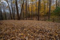 A serene landscape in Ontario, Canada, featuring a mix of deciduous and coniferous trees. The open space allows for a clear sky view. The brown forest floor is covered in dirt, gravel, and various shades of groundcover.