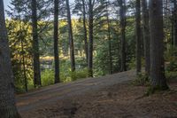 This image showcases a beautiful landscape in Ontario, Canada. The clear sky above reflects on the calm waters of a lake surrounded by dense forests. The deciduous and evergreen trees create a stunning contrast, with their trunks visible in the reflection. A road surface cuts through the landscape, covered in gravel and occasionally dirt. The vegetation on both sides of the road, including the grass and larch trees, add to the natural beauty of this scene. This photo captures the serenity and beauty of the Canadian wilderness in Ontario, particularly near the city of Toronto.