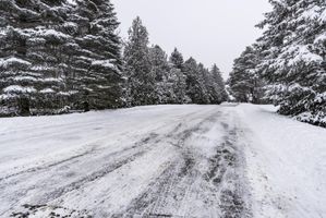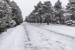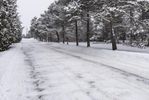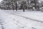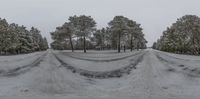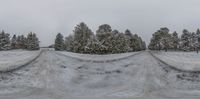 this is a shot of snow covered roads in the middle of trees on an overcast day