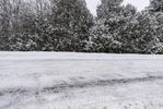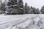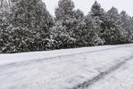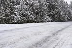 Snow-covered road in Ontario, surrounded by trees on an overcast day. Monochrome landscape with a hint of winter. Clear sky peeks through the clouds. A serene scene in Canada's winter wonderland.