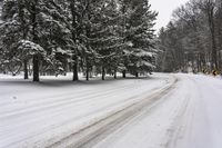 A gloomy day in Toronto, Ontario. The grey sky contrasts with the snowy landscape and the dense forest. The road surface is covered in snow, and the trees and vegetation create a natural environment.