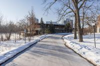 A straight view down a snow-covered road in a suburban neighborhood in Ontario. The clear winter sky contrasts with the freezing temperatures. Residential architecture lines the road, showcasing the infrastructure of the area.