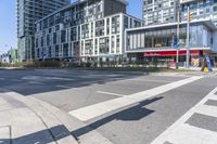 A modern architectural marvel in the heart of Toronto, Ontario. This building stands tall against a clear sky, its windows reflecting the vibrant cityscape below. The city's busy streets and bustling zebra crossings add to the urban energy.