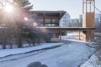 This image captures the architectural beauty of a residential area in Ontario, Canada. The photo is taken during the day, with sunlight casting a warm glow on the buildings, roads, and trees. The winter season is depicted by the freezing temperatures, ice, and clear sky above. The concrete streets and structures showcase the urban landscape, while the lens flare adds a touch of artistic flair. This photo represents the real estate and urban development in Ontario, with the sun visible in the background.