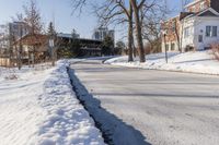This is an image of a snow-covered road in a residential area of Ontario. The asphalt road is lined with trees and leads to a suburban neighborhood. The snow on the ground and the trees indicate that it's winter and the temperature is freezing. The clear sky above adds a sense of calm and serenity to the scene. This photo captures the peacefulness of a winter day in a residential area of Ontario.