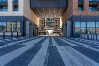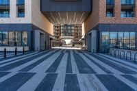 This image showcases two modern residential buildings in Toronto, Ontario, Canada. The buildings have large reflective glass windows that provide a clear view of the courtyard. The hard shadows cast by the buildings create an interesting contrast on the surface of the street. The scene is set in a suburban area with bicycle racks along the street. This photo captures the essence of suburban living in Toronto, and represents a typical day in the residential neighborhood.