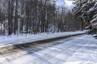 This is an image of a winter landscape in Ontario, Canada. The photo captures a road surrounded by a dense forest covered in snow. The clear sky above showcases fluffy clouds. The road surface is covered in snow, making it difficult for vehicles to pass through. The trees and branches are also coated in snow, giving a beautiful winter scene. In the foreground, there is a tire track in the snow. This picture represents a typical winter day in Ontario, highlighting the natural beauty and freezing conditions of the region.