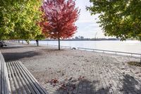 This is an image of a road surrounded by nature in Ontario, Canada. The road surface is made of asphalt and lined with grass on both sides. The trees along the road display vibrant autumn colors with branches full of deciduous leaves. The sky is dotted with fluffy clouds, and the sun shines brightly, casting a warm light on the scene. In the distance, there is a walkway next to a river, creating a peaceful and recreational public space. The image captures the beautiful landscape of Toronto, showcasing the harmony between urban architecture and natural surroundings.