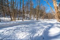 A snow-covered road in rural Ontario, with tall trees lining the path. The clear blue skies in the distance create a serene winter scene. Shadows cast by the trees add depth to the landscape.