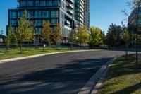 A modern city street in Toronto, Ontario. Tall buildings with sleek architecture line the road, casting hard shadows. The clear sky offers a perfect backdrop. A bustling urban scene with shops and storefronts, surrounded by green grass.