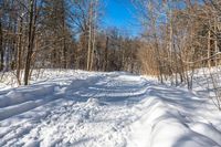 A snowy day in rural Ontario, near Toronto. The trail winds through the woods, with snow-covered trees in the distance. Clouds cast hard shadows on the road and path.