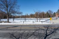 A suburban road in Ontario, lined with snow and a small park. Clear skies create a peaceful atmosphere. The road leads to Toronto, offering a recreational escape from the bustling city. A perfect day for a drive.