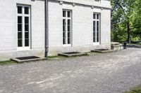 the building is made up of large windows and brick steps and cement blocks with black flooring