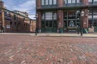 A classic Toronto street scene with brick buildings and cobblestone walkways. Clear sky and contrails add to the urban feel. Explore the city's unique architecture, cafes, and shops in the lively art district.