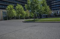 A modern architecture office building in the business district of Toronto, Ontario. The building stands tall amidst the urban landscape, surrounded by tree-lined streets and open spaces. The vibrant city life is reflected in the busy thoroughfares and bustling business activities.