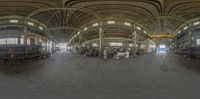 An expansive open-air factory in Los Angeles, California. Old-fashioned trains and train carts are parked inside. The industrial setting features concrete, steel, and metal beams. A glimpse into the city's rich architectural and engineering history.