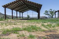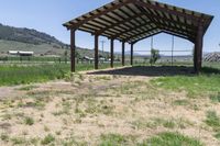 A rural landscape in Crested Butte, Colorado. An open hay shed stands next to a dirt field, surrounded by green grass and trees. Clear sky illuminates the mountain backdrop, creating a picturesque scene of tranquil open space.