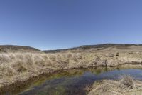 some grass bushes and water on the ground and in the air with a blue sky in the background