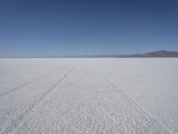 This stock photo showcases a vast open plain on a clear day with snow on the ground and magnificent mountains in the background. The serene and calm Aeolian landforms create a stunning natural environment. The scene provides a straight-down-the-road perspective, highlighting the immense open space and the beauty of the Utah desert. The blue sky, along with the nearby Salt Lake City, further adds to the breathtaking view. The dry and salt surface of the Bonneville Speedway is also visible in the distance, enhancing the unique charm of this landscape.