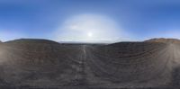 the dirt has some tracks on it and a sun in the sky above it for scale