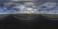 an open road with two lanes extending into the horizon, with clouds hovering from top