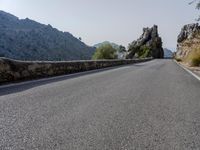 This stock photo features an open road in Spain, surrounded by low mountain landscapes. The asphalt road stretches through the rocky terrain, passing by trees and vegetation. The clear sky overhead enhances the beautiful view of the Balearic Islands in the distance. The image showcases the natural beauty and infrastructure of Spain's mountainous regions.