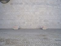 This stock photo features an open space in Lisbon, Portugal, adorned with a sandstone wall. In front of the wall, there are several benches made of wood, providing a comfortable seating area. The wall itself is made of large round stone blocks, giving it a unique and rustic appearance. The flooring is made of rectangular cobblestone, adding to the charm of the space. The architecture of the surrounding area is modern, with a museum nearby. The grey color of the wall and the flooring blends well with the overall aesthetic of the location. This image is perfect for showcasing the architectural beauty and open spaces found in Lisbon, Portugal.