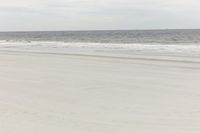 This image captures the peaceful and serene coastal environment. The photo showcases a calm sea and sandy beach, with waves gently lapping at the shore. In the distance, the horizon meets the gray sky, creating a sense of openness. The natural environment is displayed in its full glory, with the cloud-covered sky adding to the overall ambiance. This image perfectly conveys the tranquility and beauty of a day at the beach by the ocean.