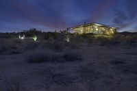 a house in the desert at night surrounded by trees and vegetation with its lights on