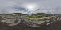 a fish - eye lens is showing a road and mountain range in the background of this image