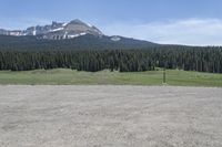 This is an image of the beautiful landscape in Colorado, USA. The photo depicts a vast open space with dirt and gravel surfaces. The mountains in the background create a stunning backdrop, while the trees and grass surface add a touch of nature to the scene. The clear sky above reflects the serene atmosphere of the wilderness. The photo captures the essence of the natural environment in Colorado, showcasing its mountain ranges, cliffs, and plains. This picturesque view is reminiscent of the highlands and land lots in the area. Experience the beauty of Colorado's wilderness in this captivating image.